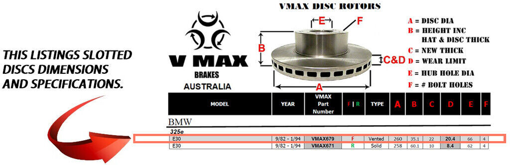 This sale is for a new pair (2 disc rotors) of Genuine VMAX Dimple Drilled & Slotted Performance Front disc brake rotors to suit BMW 325e E30 models built 1982 till 1994 and are a direct replacement item.