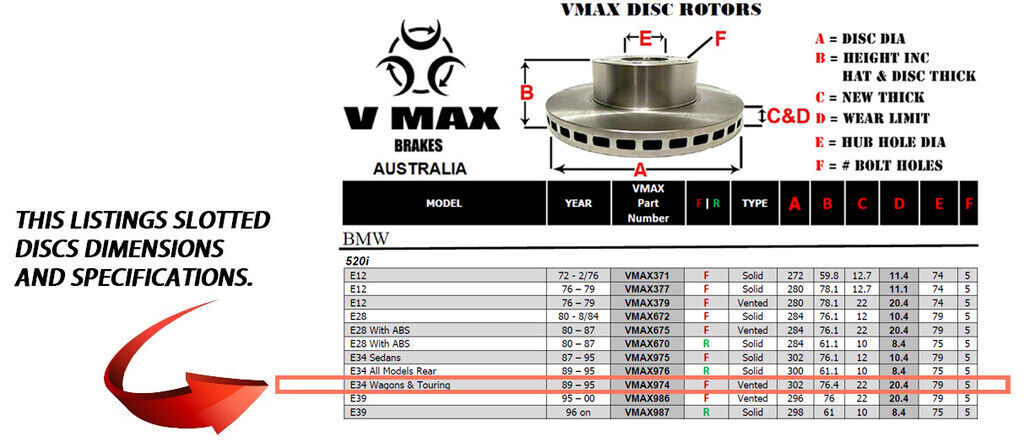 This sale is for a new pair (2 disc rotors) of Genuine VMAX Dimple Drilled & Slotted Performance Front disc brake rotors to suit BMW 520i E34 Wagons Touring models built 1989 till 1995 and are a direct replacement item.