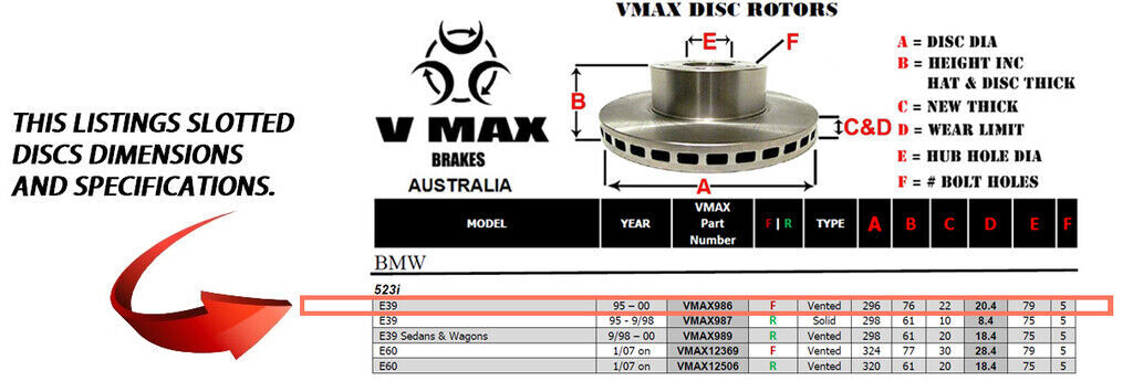 This sale is for a new pair (2 disc rotors) of Genuine VMAX Dimple Drilled & Slotted Performance Front disc brake rotors to suit BMW 523i E39 models built 1995 till 2000 and are a direct replacement item.