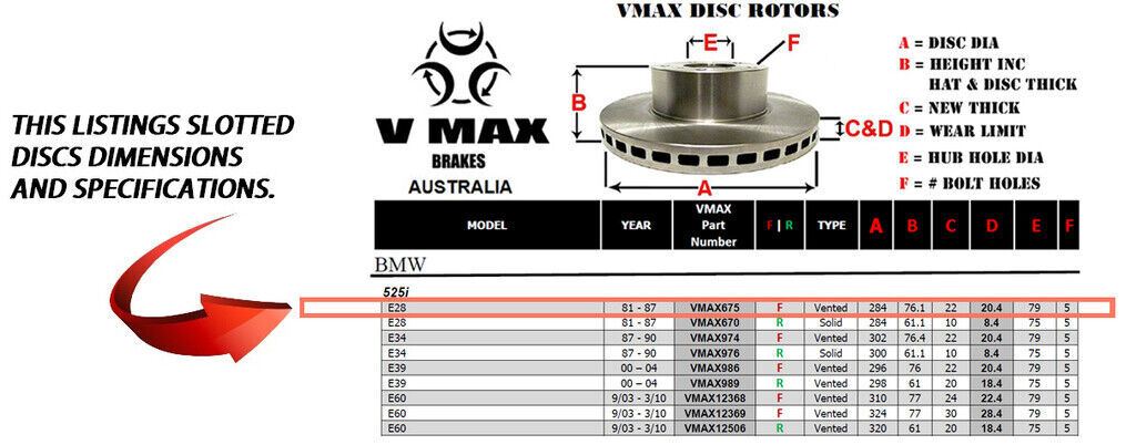 This sale is for a new pair (2 disc rotors) of Genuine VMAX Dimple Drilled & Slotted Performance Front disc brake rotors to suit BMW 525i E28 models built 1981 till 1987 and are a direct replacement item.