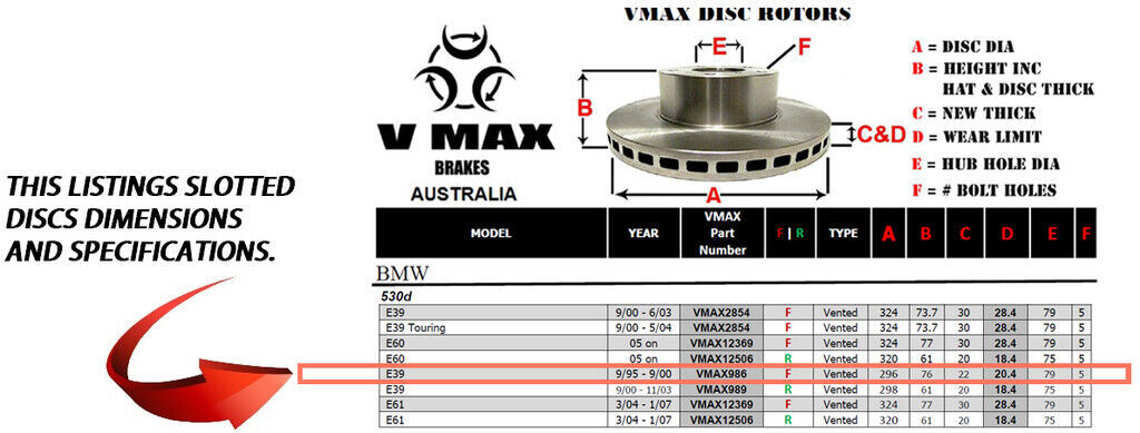 This sale is for a new pair (2 disc rotors) of Genuine VMAX Dimple Drilled & Slotted Performance Front disc brake rotors to suit BMW 530d E39 models built 1995 till 2000 and are a direct replacement item.