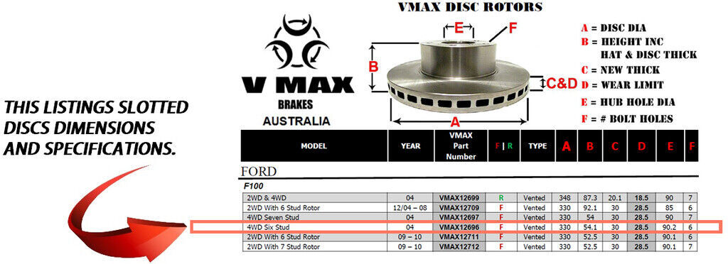 This sale is for a new pair (2 disc rotors) of Genuine VMAX Dimple Drilled & Slotted Performance Front disc brake rotors to suit FORD F100 4WD Six Stud models built 2004 and are a direct replacement item.
