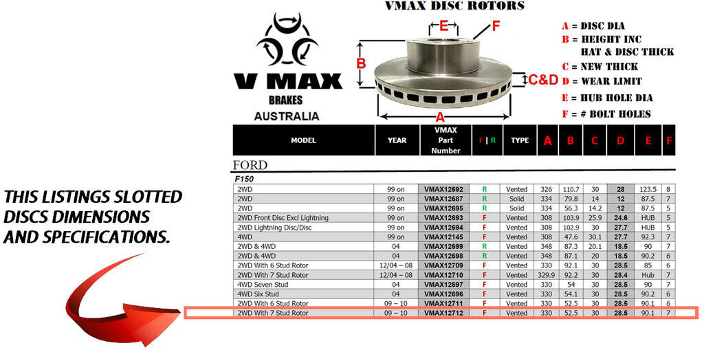 This sale is for a new pair (2 disc rotors) of Genuine VMAX Dimple Drilled & Slotted Performance Front disc brake rotors to suit FORD F150 2WD With 7 Stud Rotor models built 2009 till 2010 and are a direct replacement item.