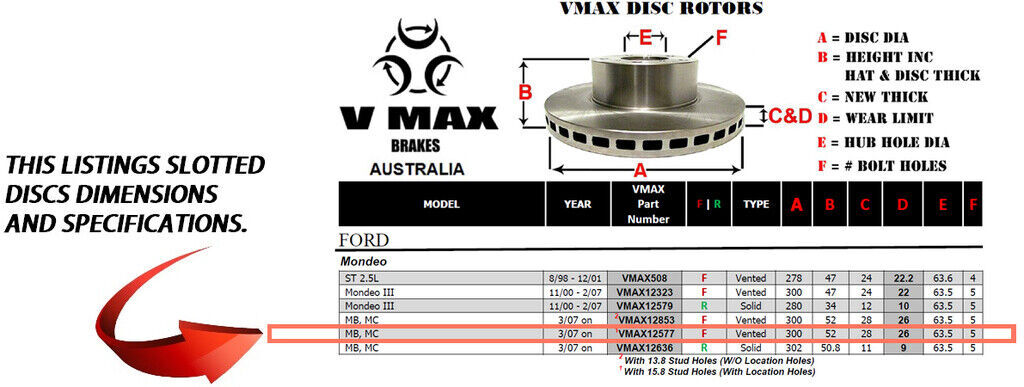 This sale is for a new pair (2 disc rotors) of Genuine VMAX Dimple Drilled & Slotted Performance Front disc brake rotors to suit FORD Mondeo MB MC 15.8mm hole models built 2007 Onwards and are a direct replacement item.