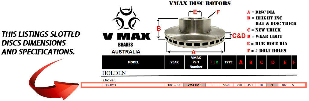 This sale is for a new pair (2 disc rotors) of Genuine VMAX Dimple Drilled & Slotted Performance Front disc brake rotors to suit HOLDEN Drover QB 4WD models built 1985 till 1987 and are a direct replacement item.