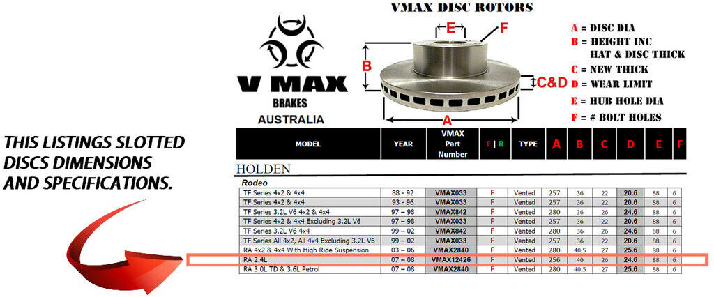 This sale is for a new pair (2 disc rotors) of Genuine VMAX Dimple Drilled & Slotted Performance Front disc brake rotors to suit HOLDEN Rodeo RA 2.4L models built 2007 till 2008 and are a direct replacement item.