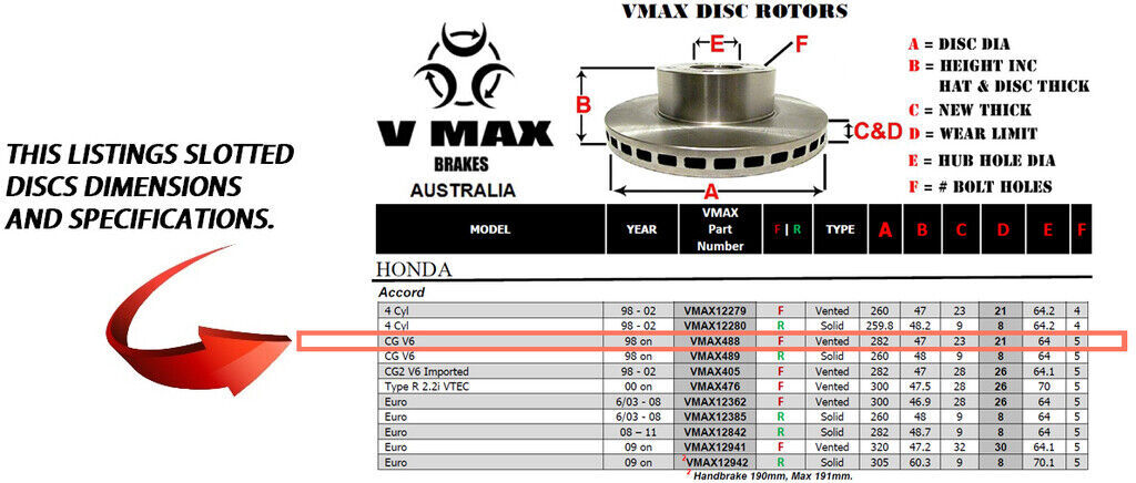 This sale is for a new pair (2 disc rotors) of Genuine VMAX Dimple Drilled & Slotted Performance Front disc brake rotors to suit HONDA Accord CG V6 models built 1998 Onwards and are a direct replacement item.
