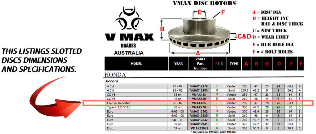 This sale is for a new pair (2 disc rotors) of Genuine VMAX Dimple Drilled & Slotted Performance Front disc brake rotors to suit HONDA Accord CG2 V6 Imported models built 1998 till 2002 and are a direct replacement item.