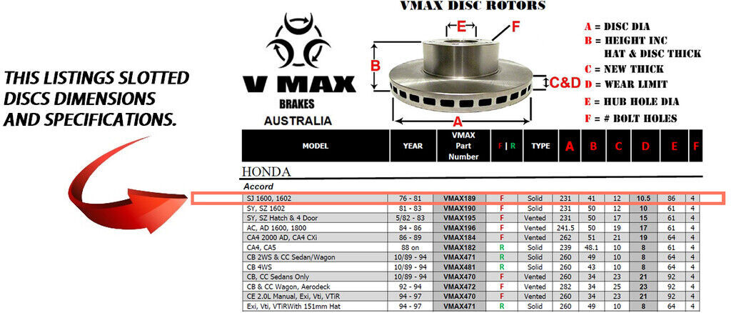 This sale is for a new pair (2 disc rotors) of Genuine VMAX Dimple Drilled & Slotted Performance Front disc brake rotors to suit HONDA Accord SJ 1600 1602 models built 1976 till 1981 and are a direct replacement item.