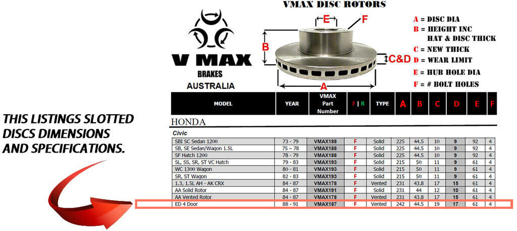 This sale is for a new pair (2 disc rotors) of Genuine VMAX Dimple Drilled & Slotted Performance Front disc brake rotors to suit HONDA Civic ED 4 Door models built 1988 till 1991 and are a direct replacement item.