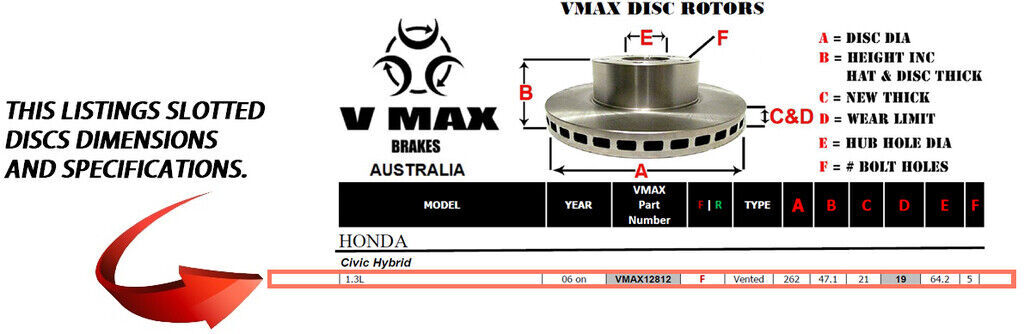 This sale is for a new pair (2 disc rotors) of Genuine VMAX Dimple Drilled & Slotted Performance Front disc brake rotors to suit HONDA Civic Hybrid 1.3L models built 2006 Onwards and are a direct replacement item.