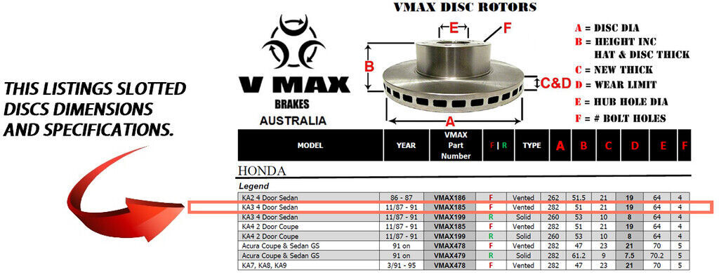 This sale is for a new pair (2 disc rotors) of Genuine VMAX Dimple Drilled & Slotted Performance Front disc brake rotors to suit HONDA Legend KA3 4 Door Sedan models built 1987 till 1991 and are a direct replacement item.