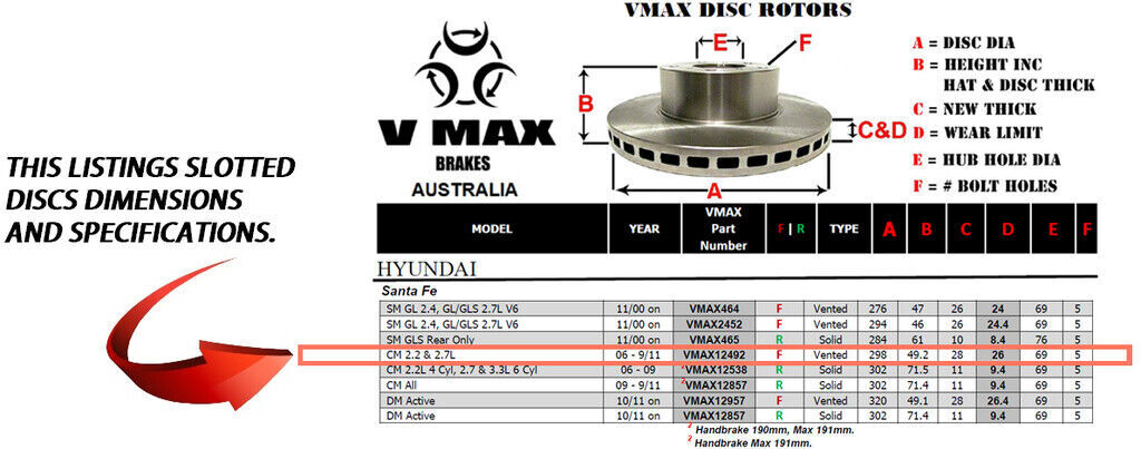 This sale is for a new pair (2 disc rotors) of Genuine VMAX Dimple Drilled & Slotted Performance Front disc brake rotors to suit HYUNDAI Santa Fe CM 2.2 2.7L models built 2006 till 2011 and are a direct replacement item.