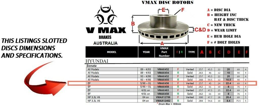 This sale is for a new pair (2 disc rotors) of Genuine VMAX Dimple Drilled & Slotted Performance Front disc brake rotors to suit HYUNDAI Sonata EF models built 1998 till 2001 and are a direct replacement item.