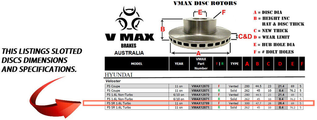 This sale is for a new pair (2 disc rotors) of Genuine VMAX Dimple Drilled & Slotted Performance Front disc brake rotors to suit HYUNDAI Veloster FS SR 1.6L Turbo models built 2011 Onwards and are a direct replacement item.