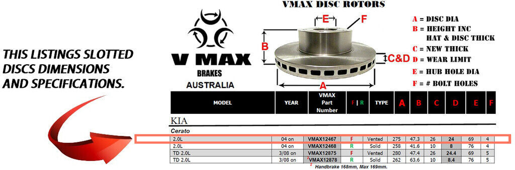This sale is for a new pair (2 disc rotors) of Genuine VMAX Dimple Drilled & Slotted Performance Front disc brake rotors to suit KIA Cerato 2.0L models built 2004 Onwards and are a direct replacement item.