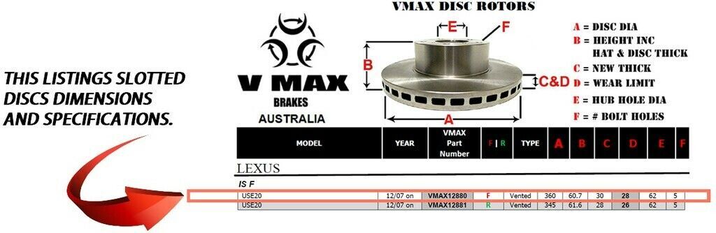 This sale is for a new pair (2 disc rotors) of Genuine VMAX Dimple Drilled & Slotted Performance Front disc brake rotors to suit LEXUS IS F USE20 models built 2007 Onwards and are a direct replacement item.