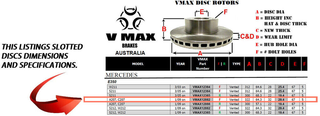 This sale is for a new pair (2 disc rotors) of Genuine VMAX Dimple Drilled & Slotted Performance Front disc brake rotors to suit MERCEDES E350 A207 C207 models built 2009 Onwards and are a direct replacement item.