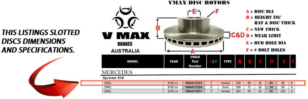 This sale is for a new pair (2 disc rotors) of Genuine VMAX Dimple Drilled & Slotted Performance Front disc brake rotors to suit MERCEDES Sprinter 516 906 models built 2008 Onwards and are a direct replacement item.