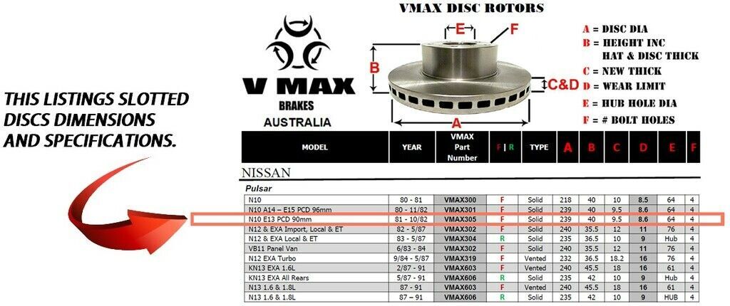 This sale is for a new pair (2 disc rotors) of Genuine VMAX Dimple Drilled & Slotted Performance Front disc brake rotors to suit NISSAN Pulsar N10 E13 PCD 90mm models built 1981 till 1982 and are a direct replacement item.