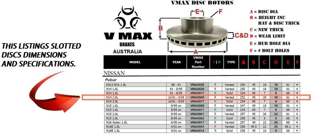 This sale is for a new pair (2 disc rotors) of Genuine VMAX Dimple Drilled & Slotted Performance Front disc brake rotors to suit NISSAN Pulsar N14 2.0L models built 1991 till 1995 and are a direct replacement item.