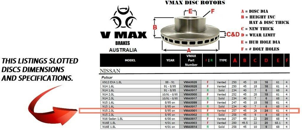 This sale is for a new pair (2 disc rotors) of Genuine VMAX Dimple Drilled & Slotted Performance Front disc brake rotors to suit NISSAN Pulsar N15 2.0L models built 1995 Onwards and are a direct replacement item.