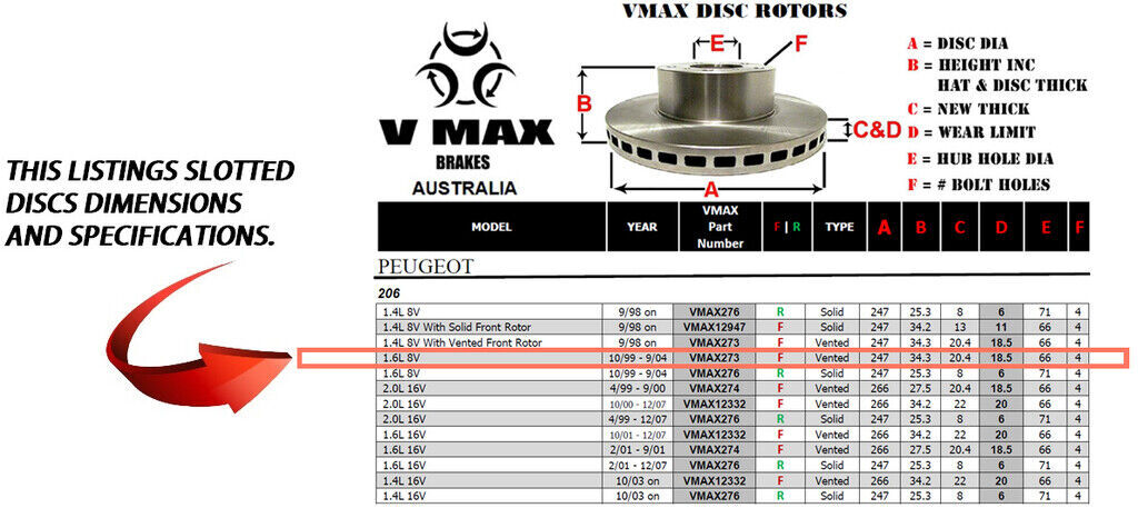 This sale is for a new pair (2 disc rotors) of Genuine VMAX Dimple Drilled & Slotted Performance Front disc brake rotors to suit PEUGEOT 206 1.6L 8V models built 1999 till 2004 and are a direct replacement item.