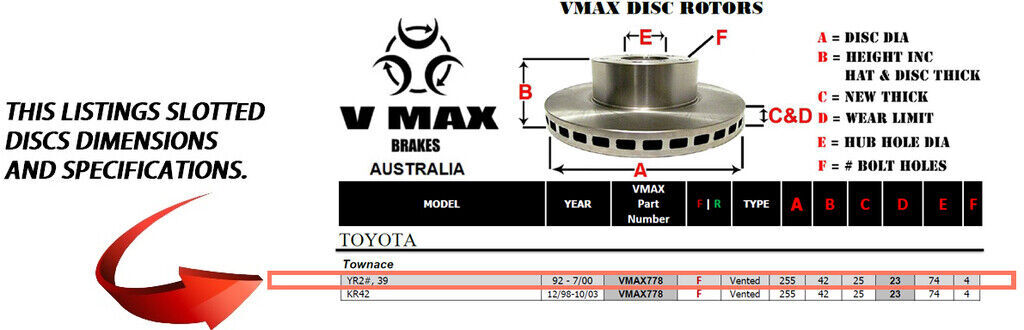 This sale is for a new pair (2 disc rotors) of Genuine VMAX Dimple Drilled & Slotted Performance Front disc brake rotors to suit TOYOTA Townace YR2 39 models built 1992 till 2000 and are a direct replacement item.