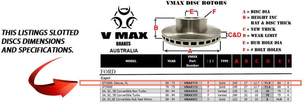 This sale is for a new pair (2 disc rotors) of Genuine VMAX Dimple Drilled & Slotted Performance Front disc brake rotors to suit FORD Capri GT1600 Deluxe XL models built 1969 till 1973 and are a direct replacement item.