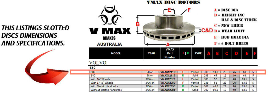 This sale is for a new pair (2 disc rotors) of Genuine VMAX Dimple Drilled & Slotted Performance Front disc brake rotors to suit VOLVO S80 models built 1998 Onwards and are a direct replacement item.