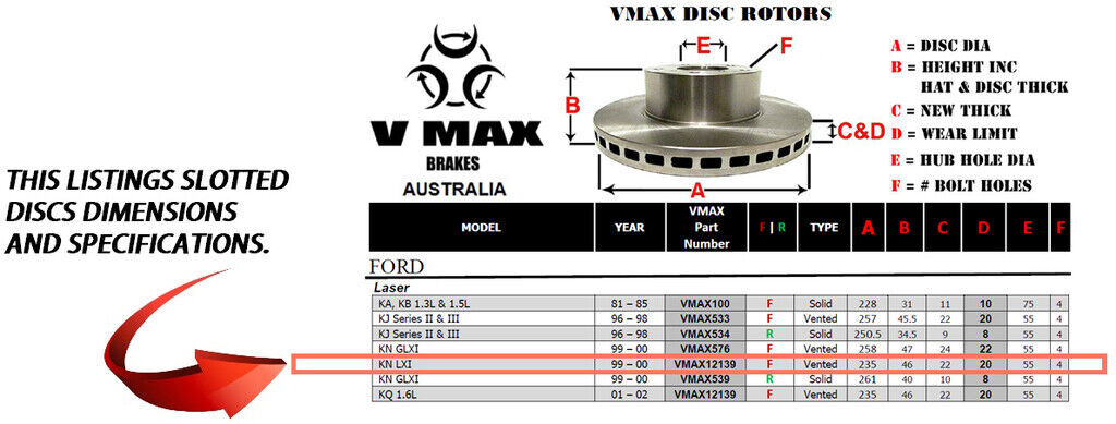 This sale is for a new pair (2 disc rotors) of Genuine VMAX Dimple Drilled & Slotted Performance Front disc brake rotors to suit FORD Laser KN LXI models built 1999 till 2000 and are a direct replacement item.
