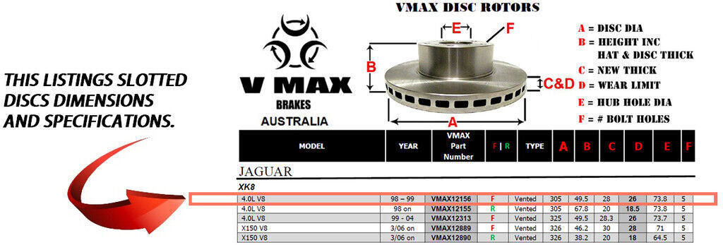 This sale is for a new pair (2 disc rotors) of Genuine VMAX Dimple Drilled & Slotted Performance Front disc brake rotors to suit JAGUAR XK8 4.0L V8 models built 1998 till 1999 and are a direct replacement item.