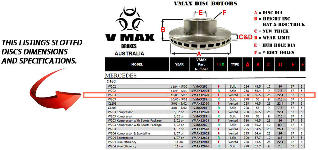 This sale is for a new pair (2 disc rotors) of Genuine VMAX Dimple Drilled & Slotted Performance Front disc brake rotors to suit MERCEDES C180 W203 models built 2000 till 2002 and are a direct replacement item.