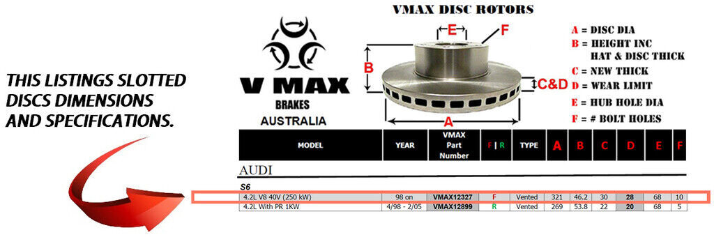 This sale is for a new pair (2 disc rotors) of Genuine VMAX Dimple Drilled & Slotted Performance Front disc brake rotors to suit AUDI S6 4.2L V8 40V 250 kW models built 1998 Onwards and are a direct replacement item.