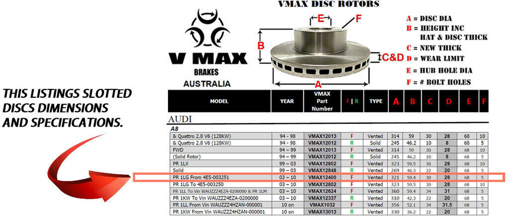 This sale is for a new pair (2 disc rotors) of Genuine VMAX Dimple Drilled & Slotted Performance Front disc brake rotors to suit AUDI A8 PR 1LG From 4E5-003251 models built 2003 till 2010 and are a direct replacement item.