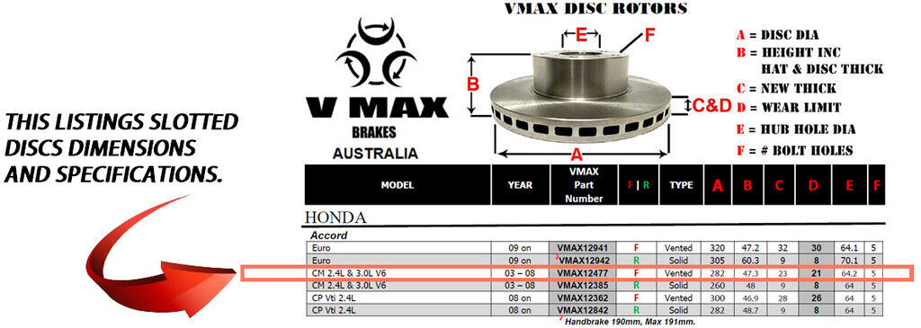 This sale is for a new pair (2 disc rotors) of Genuine VMAX Dimple Drilled & Slotted Performance Front disc brake rotors to suit HONDA Accord CM 2.4L 3.0L V6 models built 2003 till 2008 and are a direct replacement item.