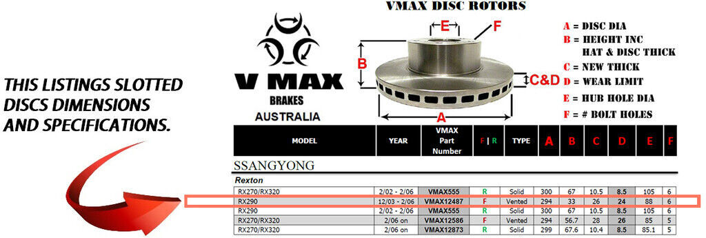 This sale is for a new pair (2 disc rotors) of Genuine VMAX Dimple Drilled & Slotted Performance Front disc brake rotors to suit SSANGYONG Rexton RX290 models built 2003 till 2006 and are a direct replacement item.