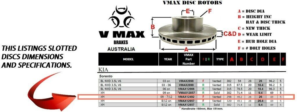 This sale is for a new pair (2 disc rotors) of Genuine VMAX Dimple Drilled & Slotted Performance Front disc brake rotors to suit KIA Sorento XM models built 2009 till 2012 and are a direct replacement item.