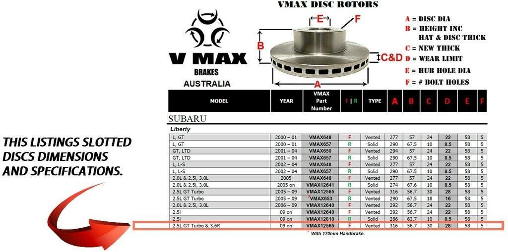 This sale is for a new pair (2 disc rotors) of Genuine VMAX Dimple Drilled & Slotted Performance Front disc brake rotors to suit SUBARU Liberty 2.5L GT Turbo 3.6R models built 2009 Onwards and are a direct replacement item.