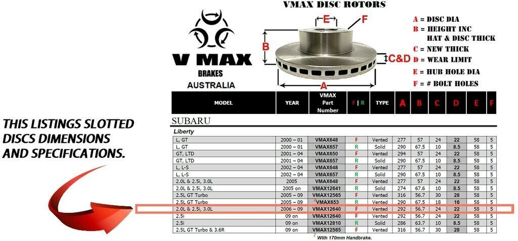 This sale is for a new pair (2 disc rotors) of Genuine VMAX Dimple Drilled & Slotted Performance Front disc brake rotors to suit SUBARU Liberty 2.0L 2.5i 3.0L models built 2006 till 2009 and are a direct replacement item.