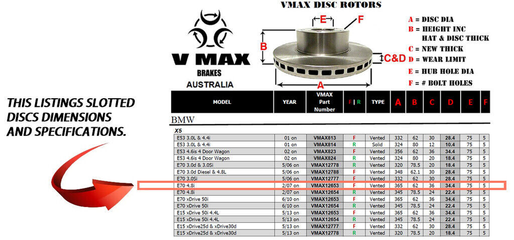 This sale is for a new pair (2 disc rotors) of Genuine VMAX Dimple Drilled & Slotted Performance Front disc brake rotors to suit BMW X5 E70 4.8i models built 2007 Onwards and are a direct replacement item.