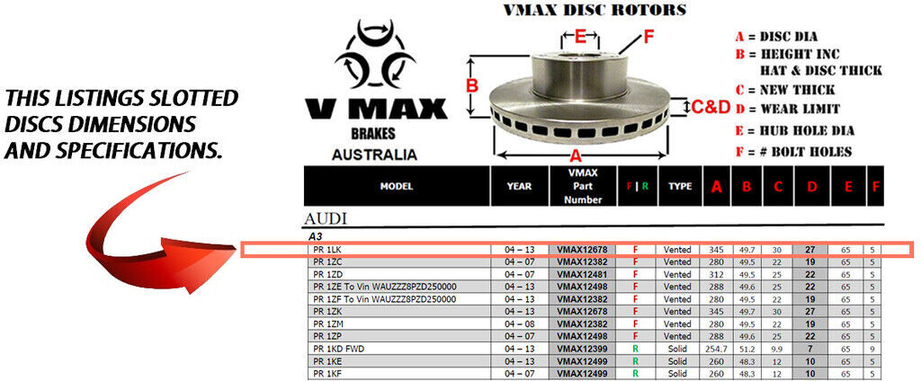 This sale is for a new pair (2 disc rotors) of Genuine VMAX Dimple Drilled & Slotted Performance Front disc brake rotors to suit AUDI A3 PR 1LK models built 2004 till 2013 and are a direct replacement item.