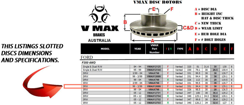 This sale is for a new pair (2 disc rotors) of Genuine VMAX Dimple Drilled & Slotted Performance Front disc brake rotors to suit FORD F350 4WD SRW models built 1999 and are a direct replacement item.