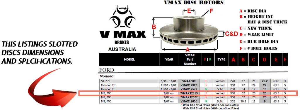 This sale is for a new pair (2 disc rotors) of Genuine VMAX Dimple Drilled & Slotted Performance Front disc brake rotors to suit FORD Mondeo MB MC 13.8mm hole models built 2007 Onwards and are a direct replacement item.