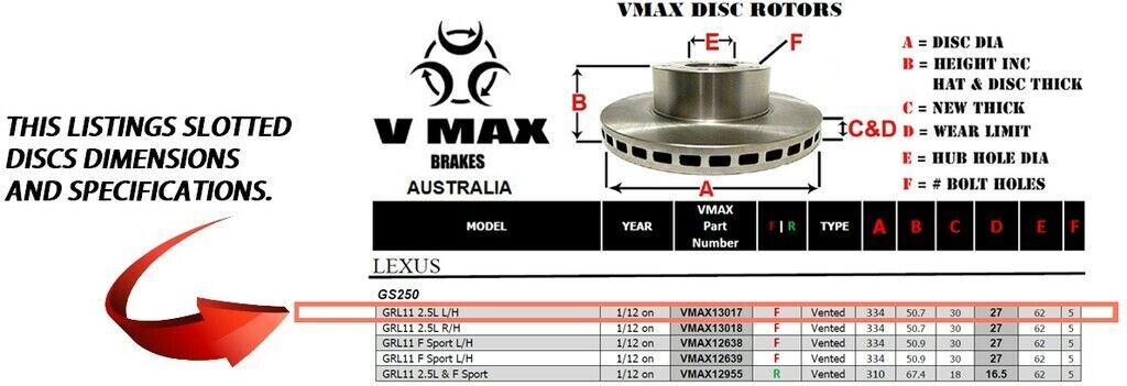 This sale is for a new pair (2 disc rotors) of Genuine VMAX Dimple Drilled & Slotted Performance Front disc brake rotors to suit LEXUS GS250 GRL11 2.5L models built 2012 Onwards and are a direct replacement item.