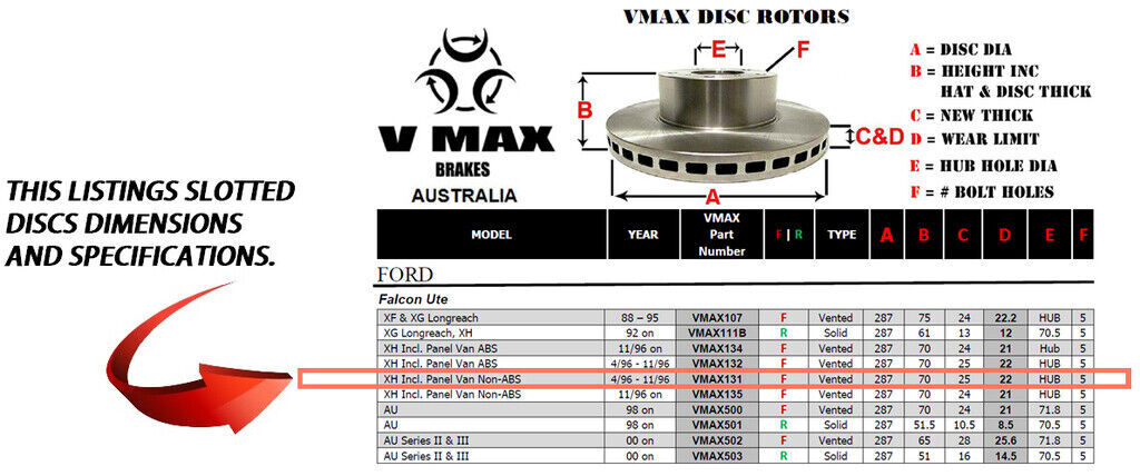 This sale is for a new pair (2 disc rotors) of Genuine VMAX Dimple Drilled & Slotted Performance Front disc brake rotors to suit FORD Falcon Ute XH Incl. Panel Van Non-ABS models built 1996 and are a direct replacement item.