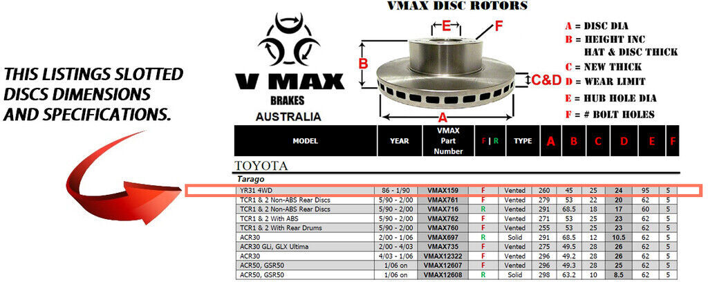 This sale is for a new pair (2 disc rotors) of Genuine VMAX Dimple Drilled & Slotted Performance Front disc brake rotors to suit TOYOTA Tarago YR31 4WD models built 1986 till 1990 and are a direct replacement item.