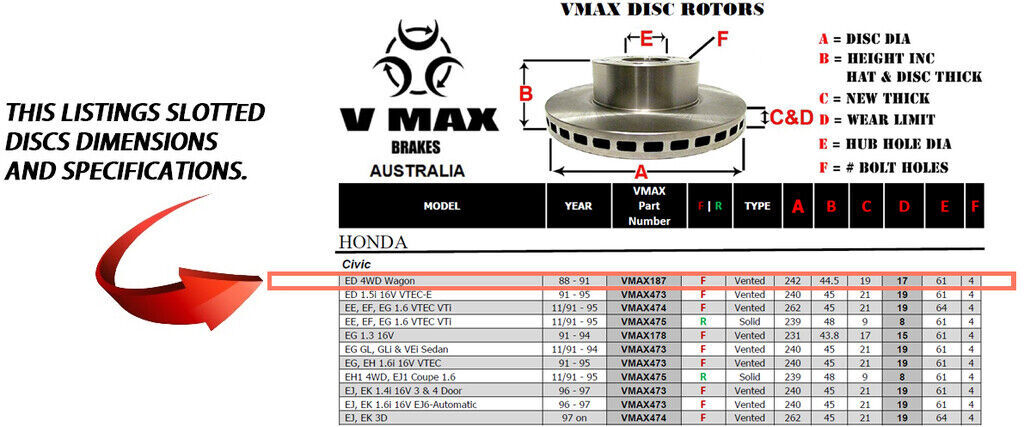 This sale is for a new pair (2 disc rotors) of Genuine VMAX Dimple Drilled & Slotted Performance Front disc brake rotors to suit HONDA Civic ED 4WD Wagon models built 1988 till 1991 and are a direct replacement item.