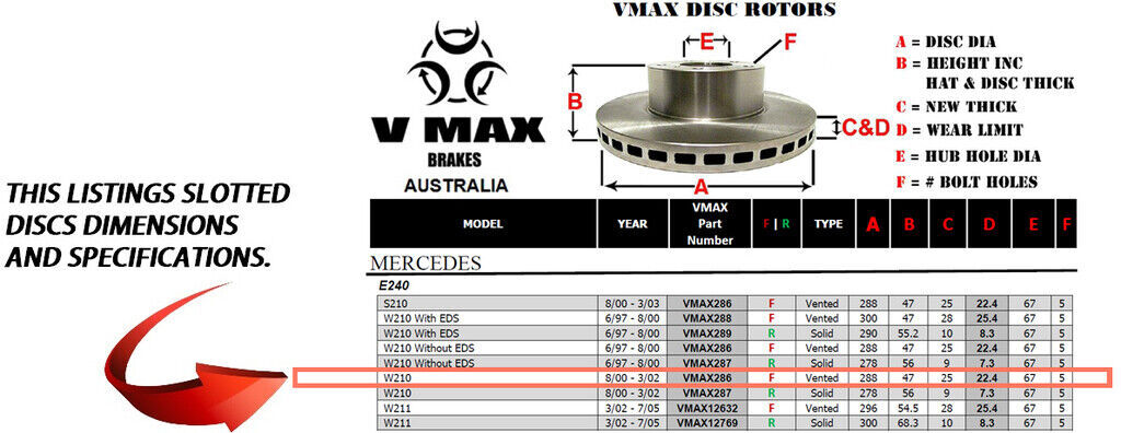 This sale is for a new pair (2 disc rotors) of Genuine VMAX Dimple Drilled & Slotted Performance Front disc brake rotors to suit MERCEDES E240 W210 models built 2000 till 2002 and are a direct replacement item.