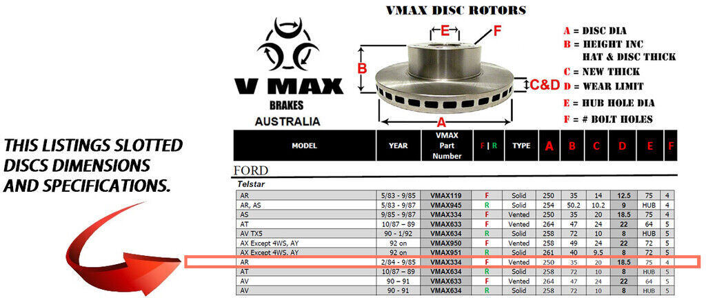 This sale is for a new pair (2 disc rotors) of Genuine VMAX Dimple Drilled & Slotted Performance Front disc brake rotors to suit FORD Telstar AR models built 1984 till 1985 and are a direct replacement item.